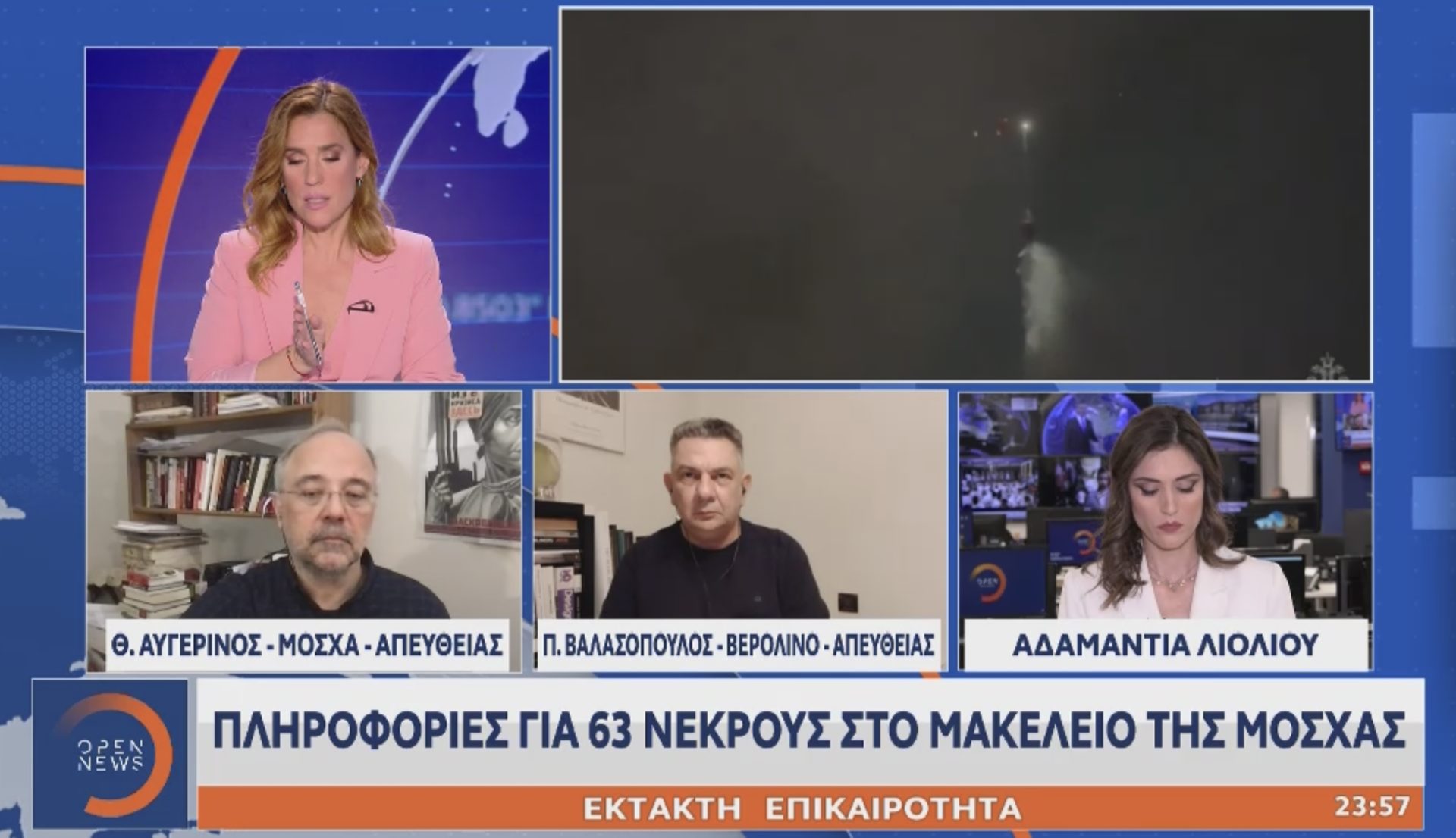 Στα όρια τους η Εύα Αντωνοπούλου και το επιτελείο του Χρήστου Παναγιωτοπουλου συνεχίζουν χωρίς διακοπή Παρασκευή βράδυ παραμονή τριημέρου τον μαραθώνιο τηλεοπτικής ενημέρωσης από τα δραματικά γεγονότα στη Μόσχα . Μόνοι μαζί με όλα τα μεγάλα διεθνή δίκτυα. Υποκλινόμαστε.