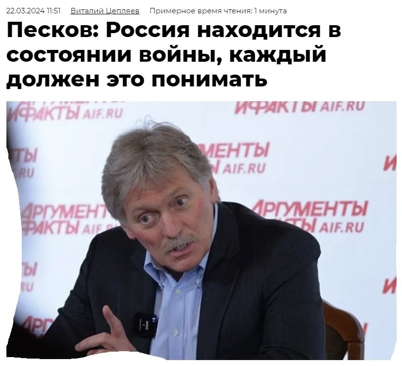 «Είμαστε σε πόλεμο. Ναι, ξεκίνησε ως μια ειδική στρατιωτική επιχείρηση, αλλά μόλις αυτή η ομάδα δημιουργήθηκε εκεί, όταν η συλλογική Δύση συμμετείχε σε αυτό στο πλευρό της Ουκρανίας, για εμάς έγινε ήδη πόλεμος. Είμαι πεπεισμένος για αυτό. Και αυτό πρέπει να το καταλάβουν όλοι για την εσωτερική τους κινητοποίηση», τόνισε ο Πεσκόφ, διευκρινίζοντας ότι το επίσημο καθεστώς της «Ειδικής Επιχείρησης στην Ουκρανία», δεν έχει αλλάξει.