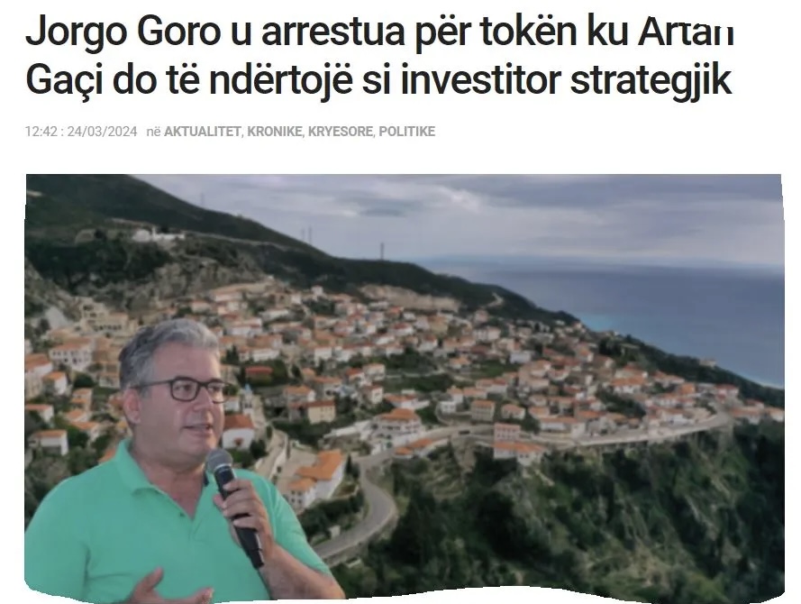 Η μήνυση που κατέθεσε στην Ειδική Εισαγγελία SPAK ο εκλεγμένος δήμαρχος της Χειμάρρας, Άλφρεντ (Φρέντης) Μπελέρης, κατά του σοσιαλιστή αντιπάλου του, Γιόργκο Γκόρο, ο οποίος συνέχιζε να ασκεί τα καθήκοντά του, αποκάλυψε τη συνεργασία του τελευταίου με άλλα πρόσωπα για την παραχώρηση με παραποιημένα έγγραφα σημαντικών εκτάσεων κρατικής γης υπέρ ιδιωτικών φορέων – τα οποία τελικά πέρασαν στην κατοχή της εταιρείας του Αρτάν Γκάτσι/ Artan Gaçi, συζύγου της σοσιαλίστριας βουλευτού και πρώην υπουργού Όλτα Τζάσκα, ο οποίος έχει κηρυχτεί από την κυβέρνηση «στρατηγικός επενδυτής» για την κατασκευή τουριστικού συγκροτήματος στη Χειμάρρα, αξίας 5,5 εκατ. ευρώ.