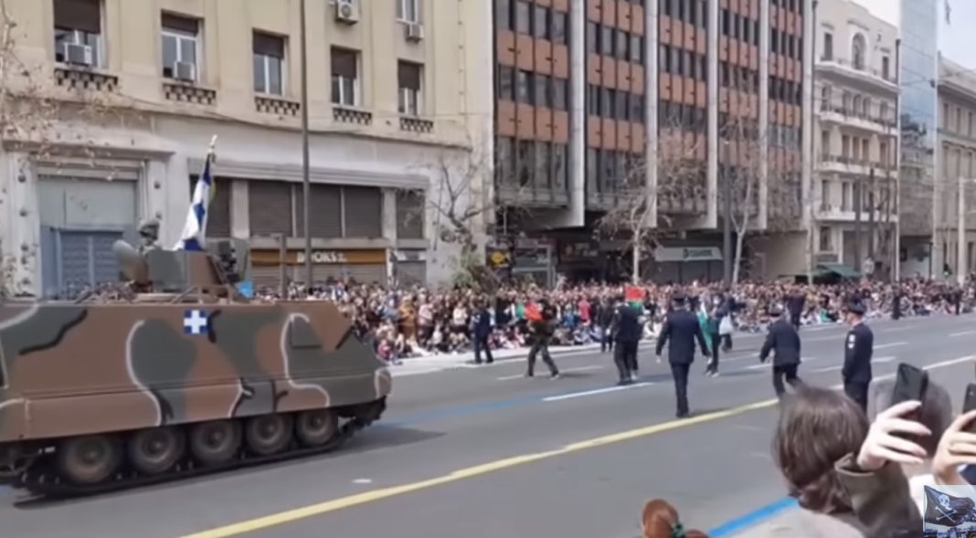 Σύμφωνα με αστυνομικές πηγές, την ώρα της παρέλασης, ορισμένοι μπήκαν μπροστά από άρματα, κρατώντας σημαίες της Παλαιστίνης. Ειδικότερα, νεαροί βρέθηκαν στη μέση του δρόμου την ώρα που περνούσαν από τον χώρο της παρέλασης τα τεθωρακισμένα οχήματα μεταφοράς προσωπικού M-113 και φώναζαν συνθήματα, κρατώντας τις σημαίες.