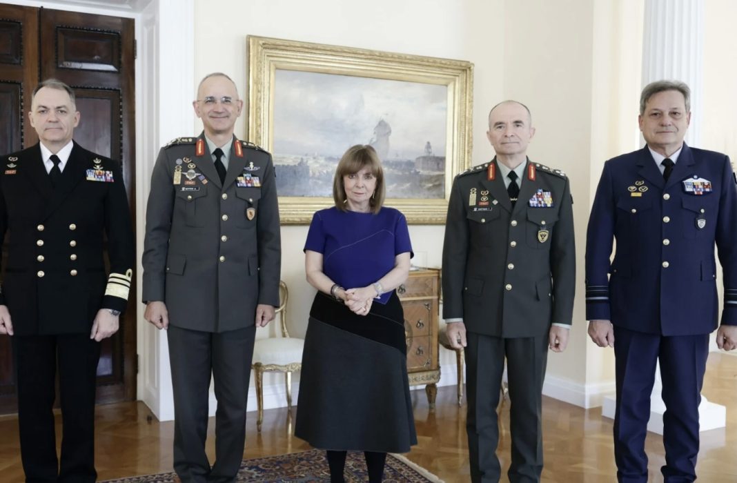 «Η Πρόεδρος της Δημοκρατίας Κατερίνα Σακελλαροπούλου παρέθεσε στο Προεδρικό Μέγαρο γεύμα στη νέα ηγεσία των Ενόπλων Δυνάμεων, τον Αρχηγό ΓΕΕΘΑ, Στρατηγό Δημήτριο Χούπη, τον Αρχηγό ΓΕΣ, Αντιστράτηγο Γεώργιο Κωστίδη, τον Αρχηγό ΓΕΝ, Αντιναύαρχο Δημήτριο – Ελευθέριο Κατάρα και τον Αρχηγό ΓΕΑ, Αντιπτέραρχο Δημοσθένη Γρηγοριάδη»
