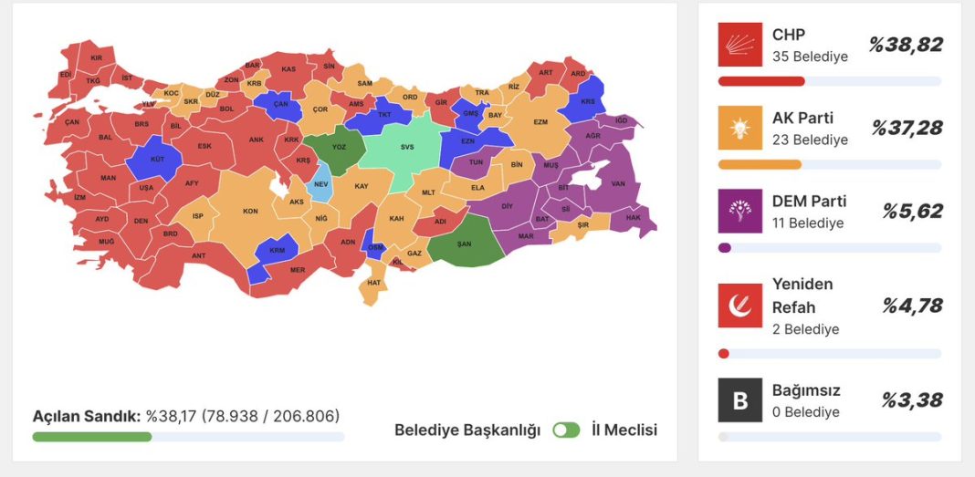 Το ΑΚΡ, όμως, χάνει και στην Επικράτεια, καθώς στο 22% των ψήφων συγκεντρώνει ποσοστό 38,16% έναντι 39,26 που συγκεντρώνει το CHP. Ως εκ τούτου, η αντιπολίτευση έχει πάρει, ξεκάθαρα πλέον, «κεφάλι» στη δυτική Τουρκία και τα μεγάλα αστικά κέντρα, ενώ το κυβερνών κόμμα εξακολουθεί να διατηρεί τις δυνάμεις του στην ενδοχώρα.