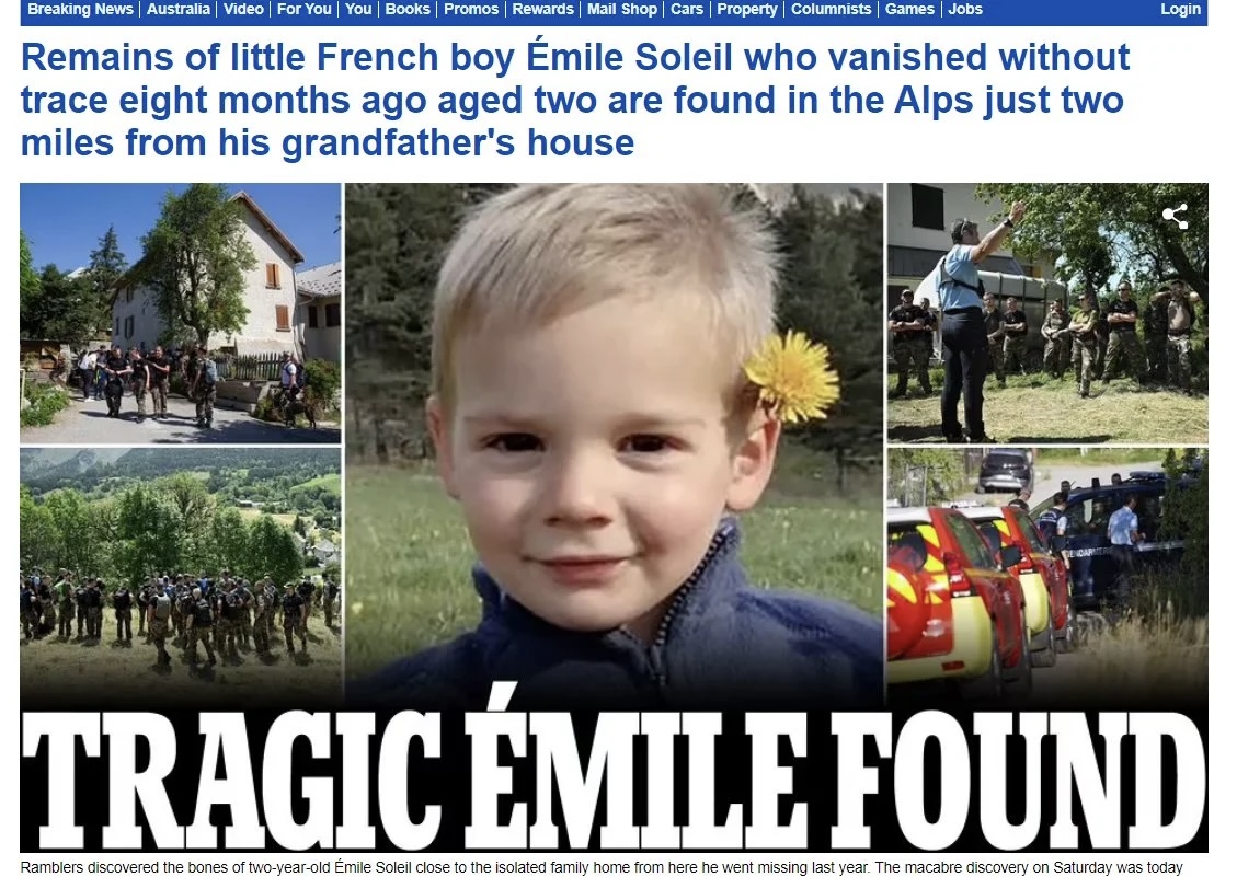 «Το Σάββατο η εθνική αστυνομία ενημερώθηκε για την ανακάλυψη οστών κοντά στον οικισμό Βερνέτ, των οποίων οι αναλύσεις γενετικής ταυτοποίησης κατέστησαν δυνατό να συμπεράνουμε σήμερα ότι ήταν τα οστά του παιδιού Εμίλ Σολέγ», ανέφερε ο εισαγγελέας, Ζαν-Λικ Μπασόν. Όταν ο μικρός Εμίλ εξαφανίστηκε στις 8 Ιουλίου, είχε μόλις φτάσει για τις καλοκαιρινές διακοπές στο εξοχικό σπίτι των παππούδων του (από την πλευρά της μητέρας του). Δύο γείτονες επιμένουν ότι τον είδαν στον κεντρικό δρόμο του χωριού Οτ-Βερνέ, αλλά υπάρχουν γενικότερα αντικρουόμενες μαρτυρίες.