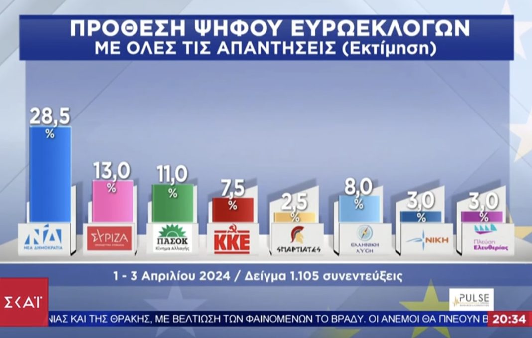 Η πρόθεση ψήφου για τις ευρωεκλογές διαμορφώνεται με τη ΝΔ να συγκεντρώνει ποσοστό 28,5%, τον ΣΥΡΙΖΑ 13%, το ΠΑΣΟΚ 11%, το ΚΚΕ 7,5%, οι Σπαρτιάτες στο 2,5%, η Ελληνική Λύση 8%, η Νίκη 3%, η Πλεύση Ελευθερίας 3%, η Νέα Αριστερά στο 2,5%.