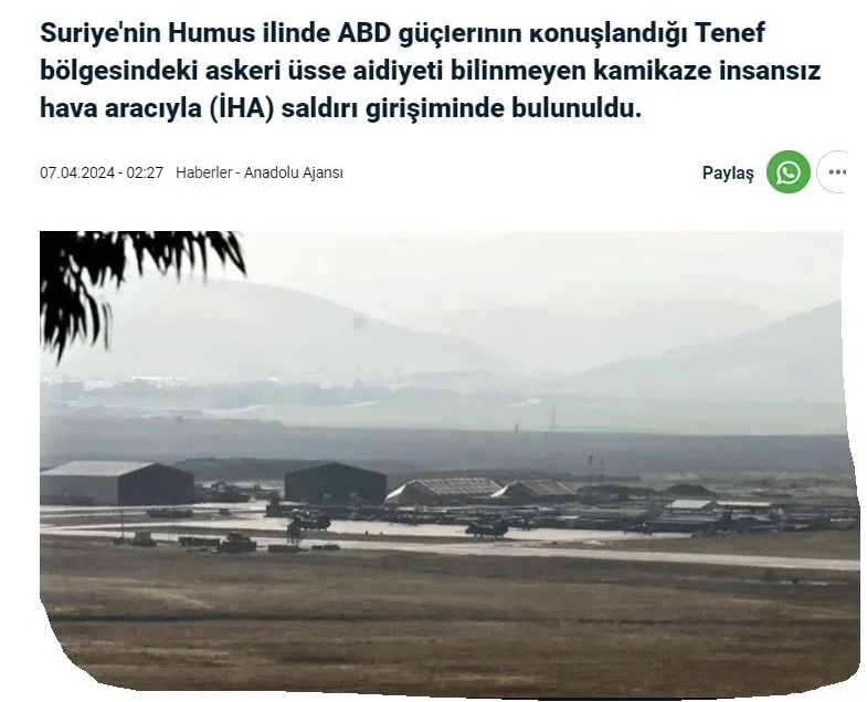 Σύμφωνα με πληροφορίες που ελήφθησαν από τοπικές πηγές, έγινε απόπειρα επίθεσης στη βάση που χρησιμοποιούν οι αμερικανικές δυνάμεις μετά τα μεσάνυχτα στο αλ Τανφ στην περιοχή της ερήμου της Χομς, κοντά στα σύνορα με την Ιορδανία, με ένα UAV καμικάζι άγνωστης προέλευσης.