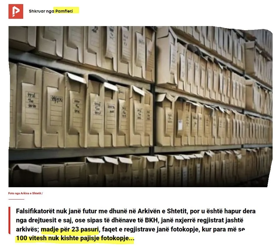 «Οι πλαστογράφοι δεν μπήκαν βίαια στα Αρχεία του Κράτους, αλλά η πόρτα,  τους άνοιξαν οι αρχηγοί τους ή σύμφωνα με τα στοιχεία της Διεύθυνσης του Εθνικού Αρχείου- BKH, οι πρωτότυποι φάκελοι αφαιρέθηκαν από το αρχείο. Επίσης,  για 23 ακίνητα, οι σελίδες των μητρώων είναι σε φωτοτυπίες, όταν πριν από 100 και πλέον χρόνια δεν υπήρχαν φωτοτυπικά μηχανήματα…», γράφει η αλβανική Pamfeti.