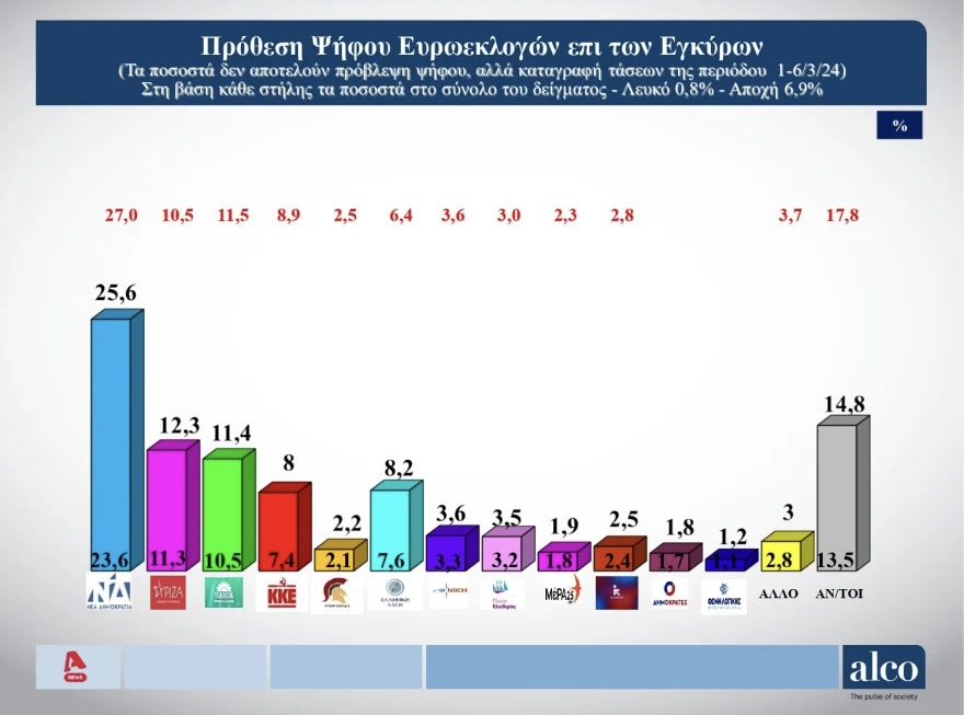 Προβάδισμα της ΝΔ αλλα με τεραστιες στη δημοσκόπηση της ALCO του Alpha με το ποσοστό της από στα έγκυρα να ειναι ανάμεσα στο 29% και το 33%. Το ΠΑΣΟΚ, παραμένει σταθερό στην πρόθεση ψήφου επί των εγκύρων, είναι στην τρίτη θέση και σε αυτή τη μέτρηση, με άνω όριο το 14%, τη στιγμή ο ΣΥΡΙΖΑ φτάνει ως και στο 16%.