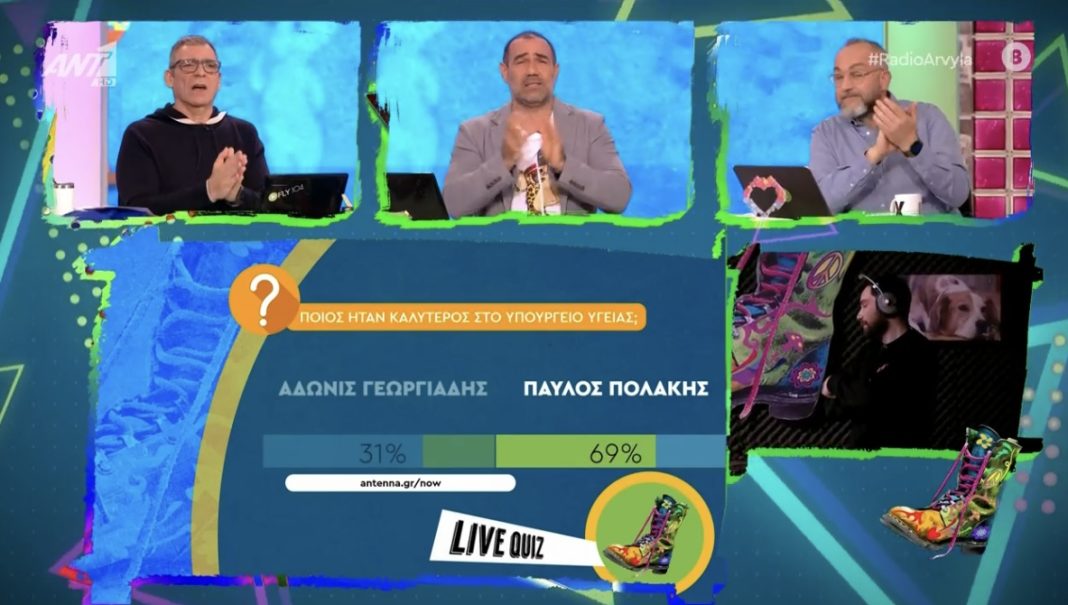 Ειναι η πρώτη φορά που ο Αδωνις Γεωργιαδης έχασε σε δημοψηφισμα ανάμεσα στους τηλεθεατές της εκπομπης του Αντώνη Κανακη, Ράδιο Αρβύλα. Νικητής στο ερώτημα ποιος ήταν καλύτερος υπουργος υγείας, ο Αδωνις Γεωργιαδης ή ο Παύλος Πολακης βγήκε ο Παύλος Πολακης με 69%.