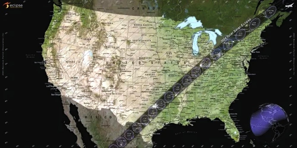 Η ολική έκλειψη Ηλίου θα ξεκινήσει με την ανατολή του Ηλίου πάνω από τον Ειρηνικό Ωκεανό, ενώ στη συνέχεια θα διασχίσει το Μεξικό και τις ΗΠΑ, από το Τέξας έως το Μέιν. Το μεγαλύτερο μέρος της Βόρειας Αμερικής θα δει μια μερική έκλειψη, αλλά οι θεατές σε μια περιοχή από το Μαζατλάν του Μεξικού, μέχρι και κοντά στο Γκάντερ του Καναδά θα βιώσουν μια ολική έκλειψη Ηλίου.