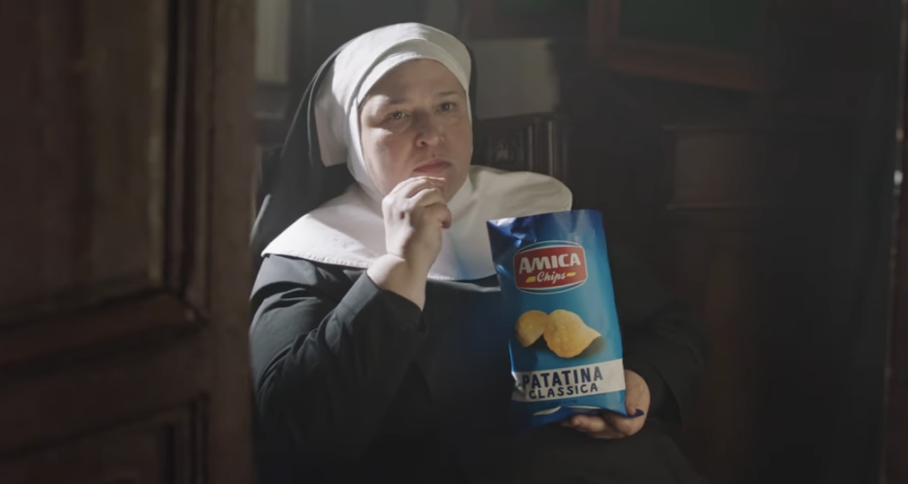 Το βίντεο διάρκειας 30 δευτερολέπτων για τα Amica Chips –κορυφαία μάρκα με πατατάκια στην Ιταλία– εκτυλίσσεται σε ένα μοναστήρι με πρωταγωνίστριες καλόγριες που ετοιμάζονται να λάβουν την Όστια.