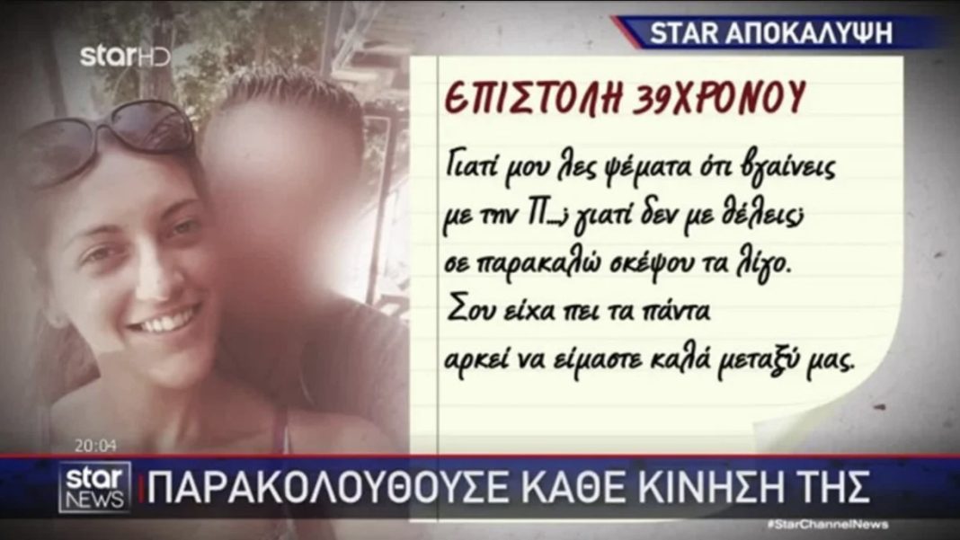 Πόσο χειριστικός και πιεστικός ήταν ο δολοφόνος της Κυριακής Γριβα καταδεικνύεται σε 8σέλιδη επιστολή που ήρθε στο φως την Πέμπτη. Ο πρώην σύντροφος της άτυχης γυναίκας έγραφε, μεταξύ άλλων, «Γιατί μου λες ψέματα; Γιατί δε με θέλεις; Σε παρακαλώ σκέψου τα λίγο» προσπαθώντας να επηρεάσει τις αποφάσεις της.
