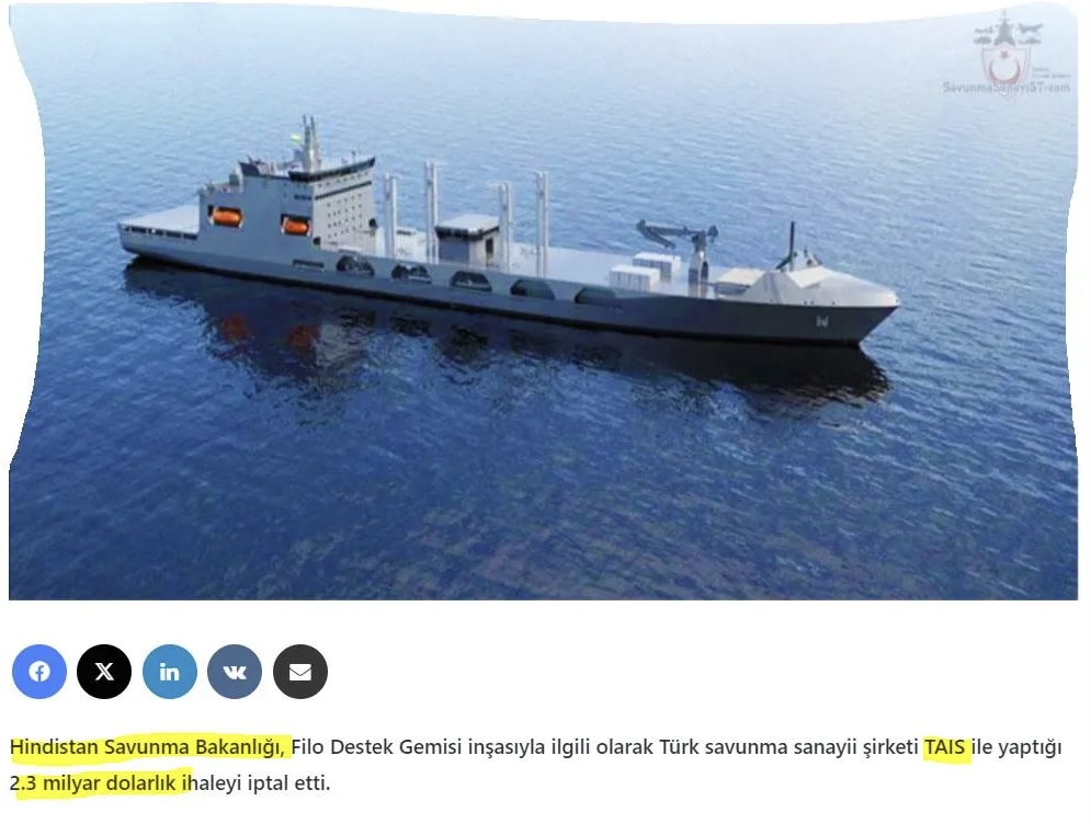 Οι ναυτιλιακές ειδήσεις της Τουρκίας (Deniz Haber) αναφέρουν ότι το ινδικό Υπουργείο Άμυνας ακύρωσε τη συμφωνία με την TAIS που ήταν για πέντε πλοία υποστήριξης στόλου (FSV).