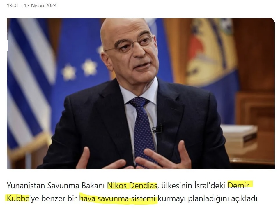 Ο Έλληνας υπουργός Άμυνας Νίκος Δένδιας ανακοίνωσε ότι η χώρα του σχεδιάζει να δημιουργήσει ένα σύστημα αεράμυνας παρόμοιο με το «Iron Dome» στο Ισραήλ, γράφουν σήμερα τα τουρκικά media.