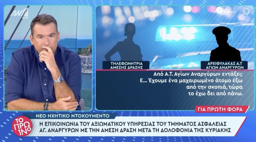 Μία τελευταία αποκάλυψη που έγινε στην πρωινή εκπομπή του Αντέννα, φέρνει στο φως της δημοσιότητας, ένα νέο ηχητικό ντοκουμέντο στο οποίο συνομιλούν ένας αστυνομικός του τμήματος των Αγίων Αναργύρων με την Άμεση Δράση αμέσως μετά το φονικό. Ο συγκεκριμένος αρχιφύλακας που κάλεσε την Άμεση Δράση για να ενημερώσει για το αιματηρό συμβάν, σοκάρει τόσο με τον τρόπο που μιλά όσο και για το πώς αντιμετωπίζει τον θάνατο μίας νέας γυναίκας, που ουσιαστικά διαδραματίστηκε μπροστά στα μάτια! Η απίστευτη νωχελικότητά του, η απάθειά του και ο αργός λόγος του είναι πρωτοφανή!