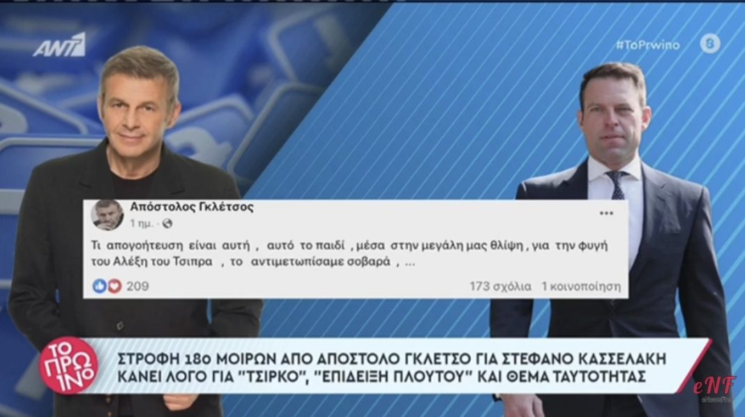 Άλλαξε στάση ο Απόστολος Γκλέτσος, αποσύροντας τη στήριξή του στον Στέφανο Κασσελάκη. Σε μια ανάρτησή του στο Facebook, ο ηθοποιός, πρώην δήμαρχος και υποψήφιος του ΣΥΡΙΖΑ στις τελευταίες αυτοδιοικητικές εκλογές, κάνει λόγο για «απογοήτευση», ενώ σε σχόλια – απαντήσεις σε διαδικτυακούς του φίλους λέει ότι δεν πρόκειται να τον ψηφίσει.