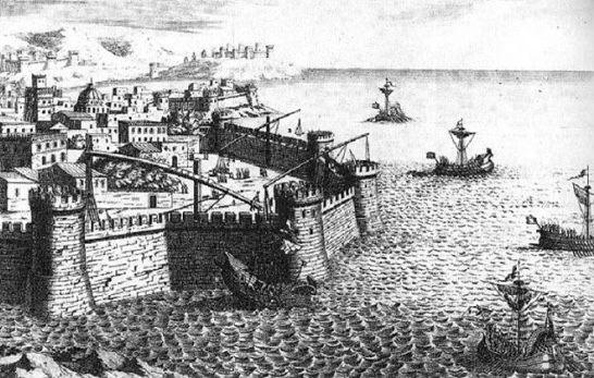 Ξαφνικά όμως στο τείχος φάνηκαν να ανοίγουν θυρίδες. Από αυτές άρχισαν να εκτοξεύονται εκατοντάδες βλήματα οξυβελών καταπελτών, τα οποία θέριζαν τους Ρωμαίους στρατιώτες και ναύτες.