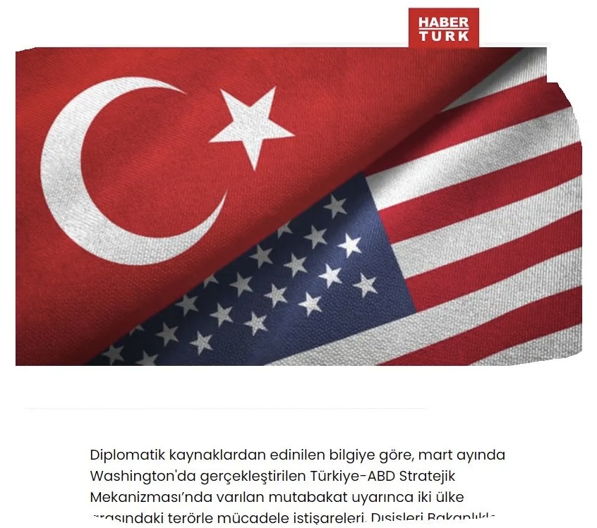 Πληροφορίες που ελήφθησαν από διπλωματικές πηγές, αναφέρουν ότι επιτεύχθηκε συμφωνία στον Στρατηγικό Μηχανισμό Τουρκίας-ΗΠΑ για την τρομοκρατία, στη συνάντηση που πραγματοποιήθηκε πρώτα στην Ουάσιγκτον τον Μάρτιο, καθώς και σήμερα, 22 Απριλίου, στην Άγκυρα, αναφέρουν τουρκικά δημοσιεύματα.