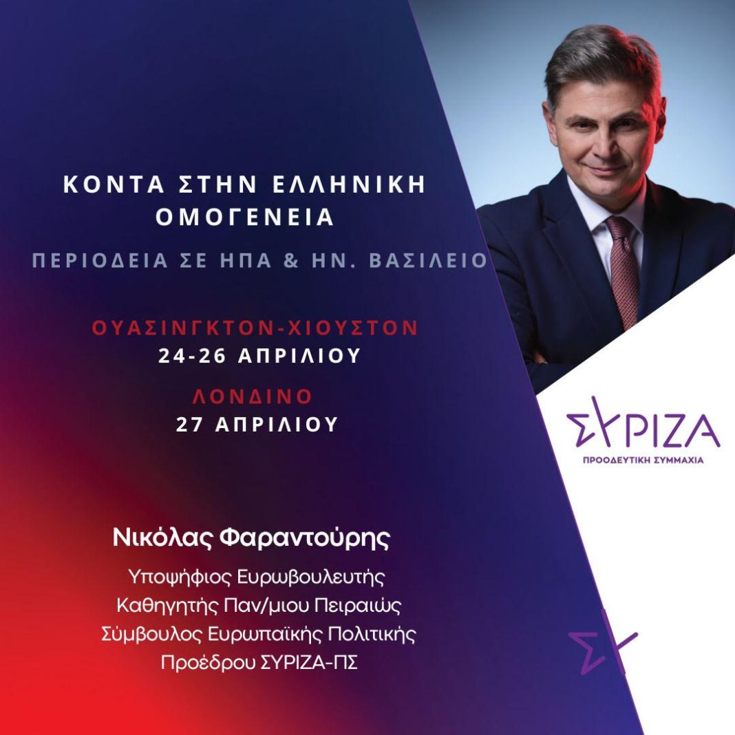 Στις Ηνωμένες Πολιτείες μεταβαίνει ο Σύμβουλος Ευρωπαϊκής Πολιτικής του Προέδρου του ΣΥΡΙΖΑ και υποψήφιος Ευρωβουλευτής Νικόλας Φαραντούρης, 24-26 Απριλίου για επαφές με την ομογένεια και τους Έλληνες αποδήμους.