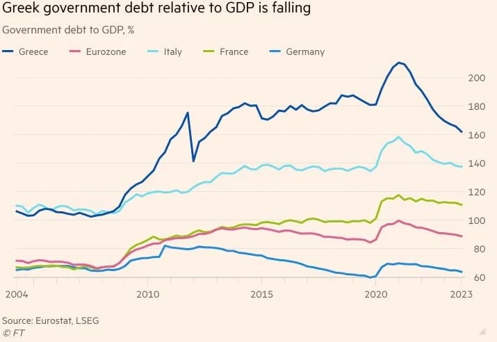 Από το 2019, πριν από την πανδημία, η Ελλάδα αναπτύχθηκε με σχεδόν διπλάσιο ρυθμό από τον ρυθμό της Ευρωζώνης. Την περασμένη εβδομάδα το ΔΝΤ είπε ότι η ελληνική οικονομία θα επεκταθεί κατά 2% και φέτος (2024) και θα συνεχίσει να ξεπερνά τον μέσο ρυθμό ανάπτυξης της νομισματικής ένωσης για τα επόμενα δύο χρόνια (βοηθούν τουρισμός και μεταρρυθμίσεις).