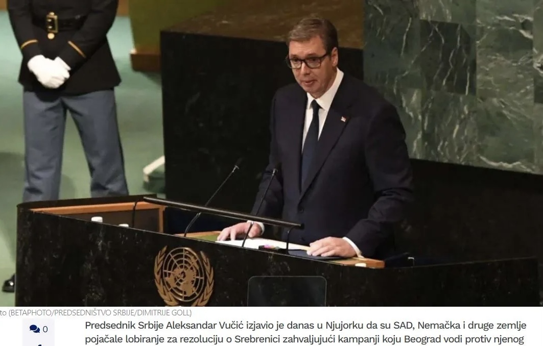 Ο Σέρβος πρόεδρος Αλεξάνταρ Βούτσιτς δήλωσε σήμερα στη Νέα Υόρκη ότι οι ΗΠΑ, η Γερμανία και άλλες χώρες έχουν εντείνει τις πιέσεις για το ψήφισμα για τη Σρεμπρένιτσα με αφορμή την εκστρατεία της οποίας ηγείται το Βελιγράδι κατά της έγκρισής του.