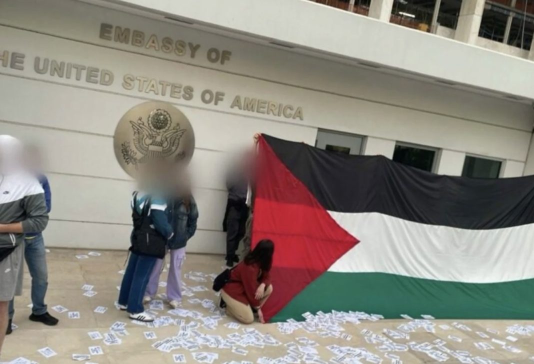 H φοιτητική ομάδα του Ρουβίκωνα πραγματοποίησε παρέμβαση την Μεγάλη Τρίτη έξω από την πρεσβεία των Ηνωμένων Πολιτειών. Τα μέλη της πέταξαν τρικάκια και τοποθέτησαν σημαία της Παλαιστίνης σε ένδειξη διαμαρτυρίας για τον πόλεμο στην Λωρίδα της Γάζας και την καταστολή φοιτητικών κινητοποιήσεων σε αμερικανικά πανεπιστήμια.