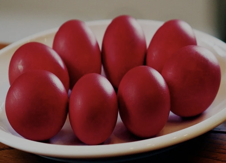 Η χριστιανική παράδοση θέλει τα αυγά, σύμβολο της γονιμότητας και της έναρξης ενός νέου κύκλου ζωής, να βάφονται κόκκινα, γιατί συμβολίζουν το Αίμα του Χριστού.