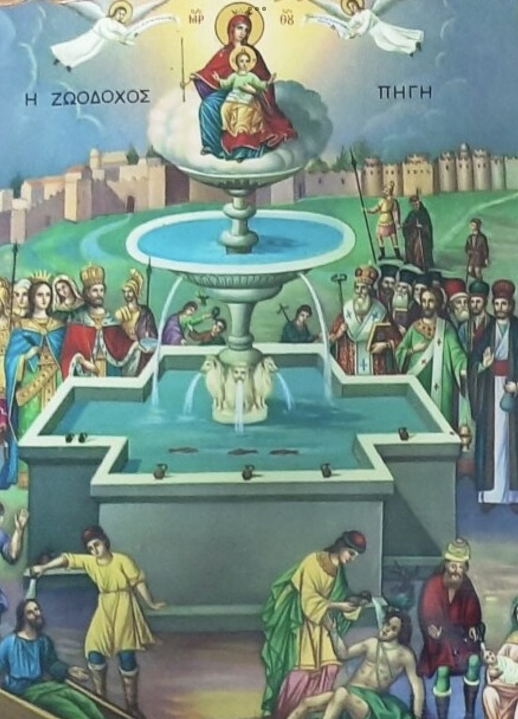 Την Παναγία μας, που την τιμάμε όλη την διάρκεια της Σαρακοστής με την ακολουθία των Χαιρετισμών, την τιμάμε και αμέσως μετά την ανάσταση με τη γιορτή της Ζωοδόχου Πηγής.