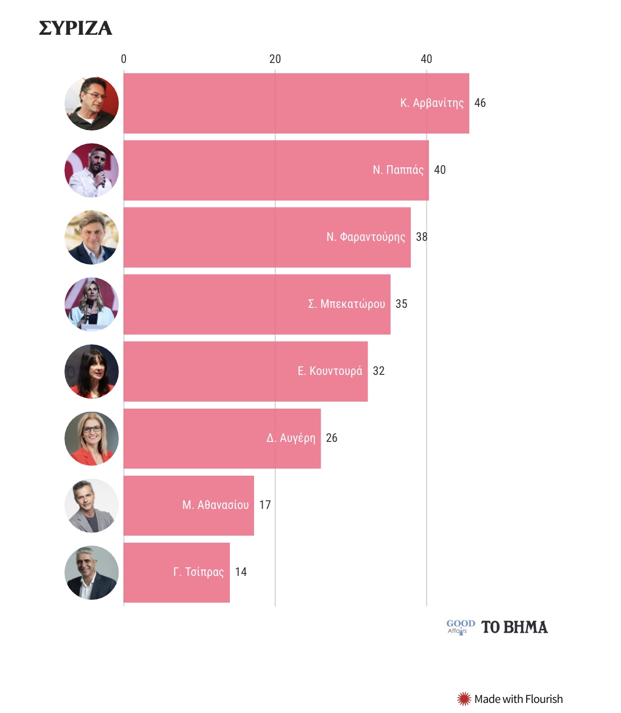 Στον ΣΥΡΙΖΑ προηγείται ο Κώστας Αρβανίτης και στη δεύτερη θέση με υψηλά ποσοστά ακολουθεί ο μπασκετμπολίστας Νίκος Παππάς. Νικόλας Φαραντούρης, Σοφία Μπεκατώρου και Δώρα Αυγέρη συμπληρώνουν την πεντάδα.