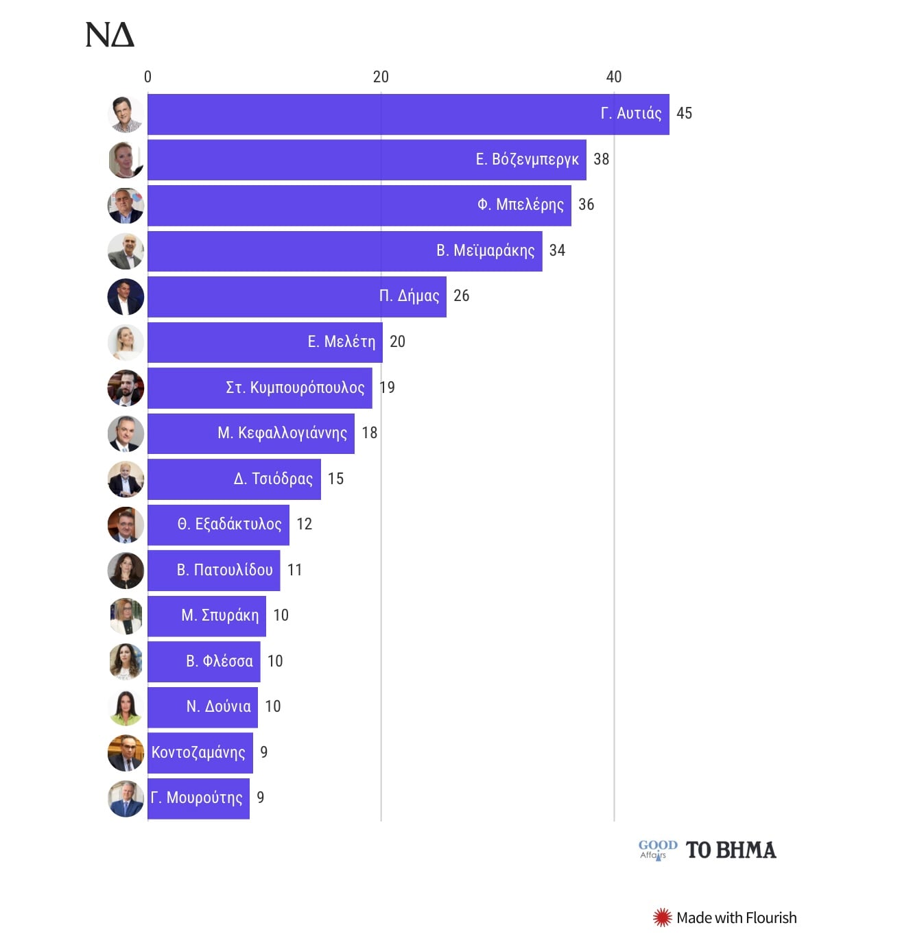 Πιο, συγκεκριμένα στη ΝΔ την κούρσα οδηγεί ο γνωστός δημοσιογράφος Γιώργος Αυτιάς, και ακολουθεί η Ελίζα Βόζεμπεργκ, ο Φρέντης Μπελέρης, ο Βαγγέλης Μεϊμαράκης και ο Πύρος Δήμας, που κλείνει την πρώτη πεντάδα.