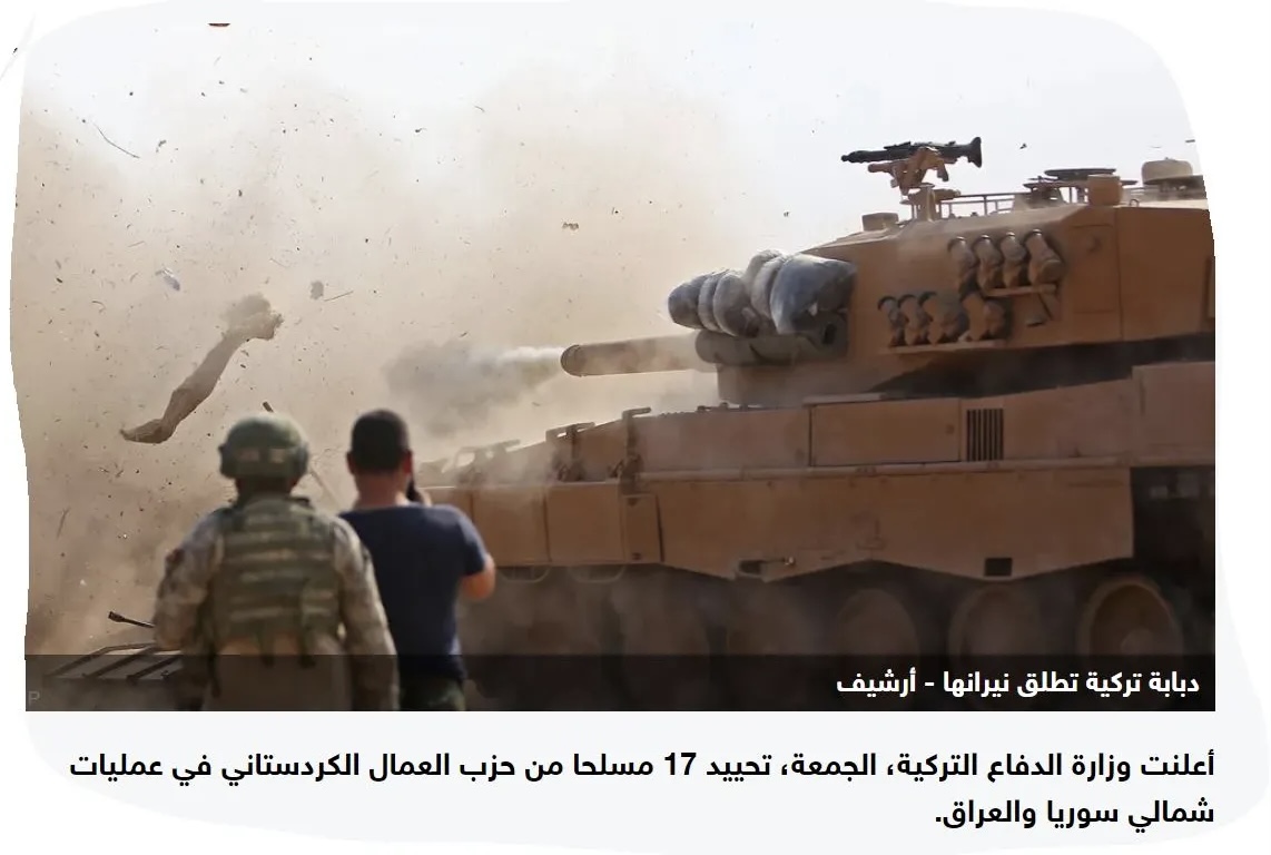 Το τουρκικό υπουργείο Άμυνας ανακοίνωσε, την Παρασκευή, την εξουδετέρωση 17 μαχητών του Εργατικού Κόμματος του Κουρδιστάν- PKK,  σε επιχειρήσεις στη βόρεια Συρία και το Ιράκ.