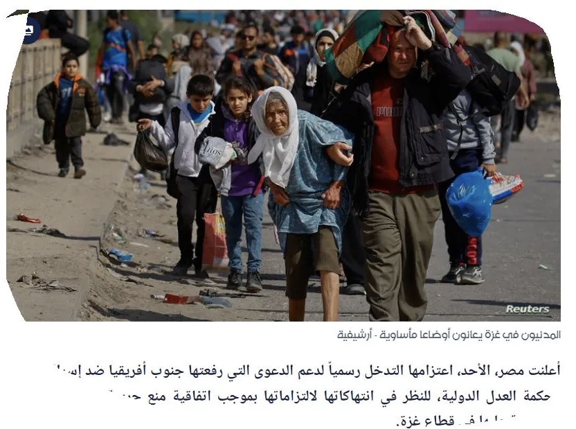 Η Αίγυπτος ανακοίνωσε, την Κυριακή, την πρόθεσή της να παρέμβει επίσημα για να υποστηρίξει τη αγωγή που κατέθεσε η Νότια Αφρική κατά του Ισραήλ ενώπιον του Διεθνούς Δικαστηρίου, προκειμένου να εξετάσει τις παραβιάσεις των υποχρεώσεών της βάσει της Σύμβασης για την Πρόληψη και Τιμωρία του Εγκλήματος της Γενοκτονίας στη Λωρίδα της Γάζας, σύμφωνα με την αμερικανική ιστοσελίδα στην αραβική Al Hurra.