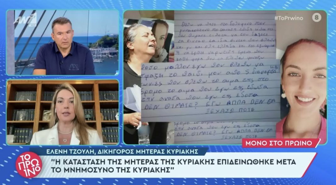 Οπως ειπε η συνήγορος της, Έλενα Τζουλη στην εκπομπή του Γιώργου Λιάγκα, η μητερα της Κυριακής της εκμυστηρεύτηκε πως θέλει να δώσει τελος στη ζωη της. Αμεσως η δικηγορος της μιλησε με ψυχίατρο και τηλεφώνησε μάλιστα η ίδια στον Αδωνι Γεωργιαδη ζητώντας του την βοήθεια του ώστε να νοσηλευτεί σε ψυχιατρική κλινική η μητερα της Κυριακής.