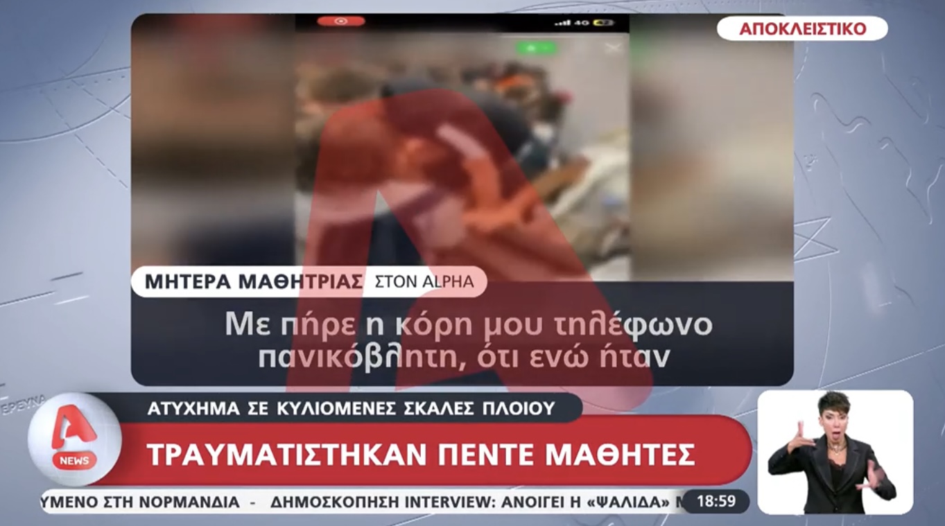 Μιλώντας στον Alpha γονείς των παιδιών που τραυματίστηκαν κατήγγειλαν: «Με πήρε η κόρη μου τηλέφωνο πανικόβλητη, ότι ενώ ήταν στις σκάλες του πλοίου, ξαφνικά ξεκίνησε η κύληση. Έπεσε κάτω ένα κορίτσι, του έπιασε τα μαλλιά, μου λέει η κόρη μου ότι είχε πάρα πολλά αίματα».