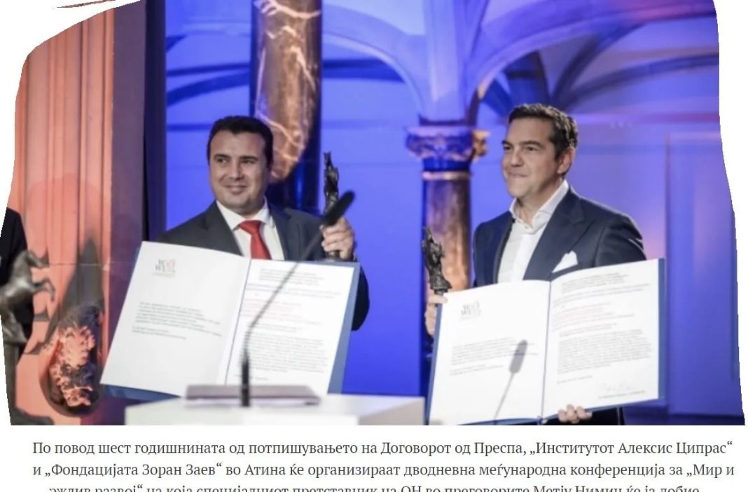Με αφορμή την έκτη επέτειο από την υπογραφή της Συμφωνίας των Πρεσπών, το «Ινστιτούτο Αλέξης Τσίπρας» και το «Ίδρυμα Ζόραν Ζάεφ» στην Αθήνα θα διοργανώσουν διήμερο διεθνές συνέδριο με θέμα «Ειρήνη και Βιώσιμη Ανάπτυξη» στο οποίο ο Ειδικός εκπρόσωπος για τις διαπραγματεύσεις Μάθιου Νίμιτς θα λάβει το βραβείο για την ειρήνη, το λεγόμενο «Βραβείο Πρεσπών», ανέφερε ο ανταποκριτής του ΜΙΑ από την Αθήνα.