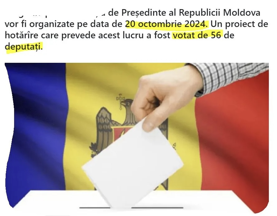 Οι εκλογές για τη θέση του Προέδρου της Δημοκρατίας της Μολδαβίας θα διεξαχθούν στις 20 Οκτωβρίου 2024. Το σχέδιο απόφασης που καθορίζει την ημερομηνία ψηφίστηκε από 56 βουλευτές.