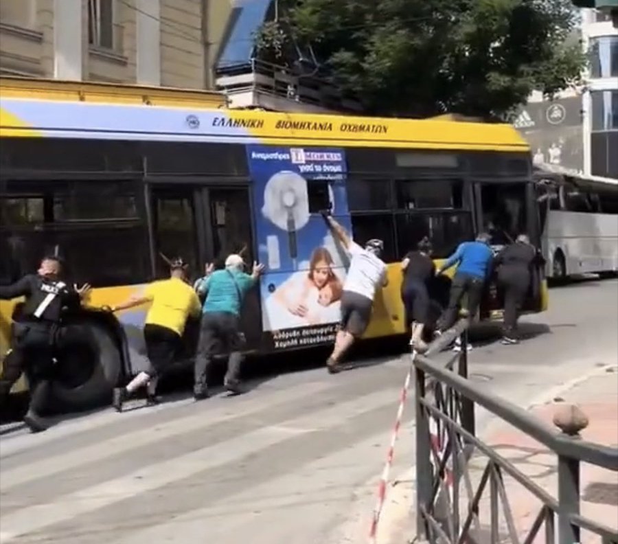 Χαμός στη Συγγρου: Χαλασε τρόλεϊ και ποδηλάτες μαζί με τους επιβάτες το έσπρωχναν για να συνεχιστεί ο Ποδηλατικός Γύρος