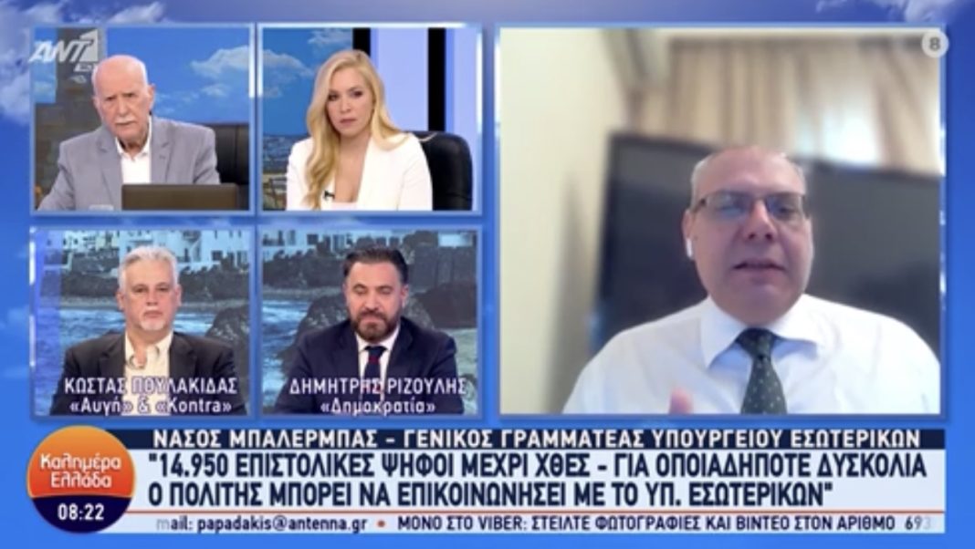 Ο Νάσος Μπαλέρμπας, Γενικός Γραμματέας του Υπουργείου Εσωτερικών μιλώντας στον ΑΝΤ1 για θέματα που αφορούν τις ευρωεκλογές και ιδιαίτερα την επιστολική ψήφο ανέφερε πως από τους περίπου 202.500 εκλογείς που έχουν δηλώσει ότι θα ψηφίσουν με επιστολή, οι 14.950 έχουν ήδη ψηφίσει και αποστείλει τον φάκελο με την ψήφο τους προς το Υπουργείο.