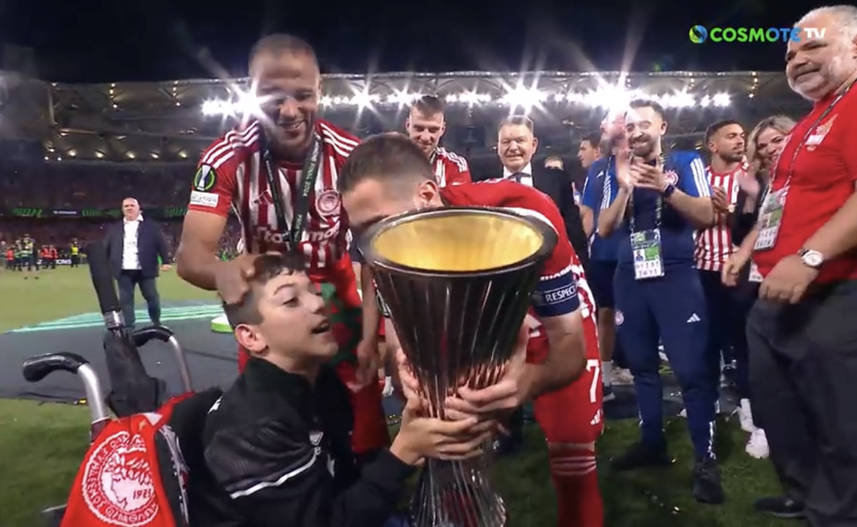 Ο αρχηγός του Ολυμπιακού, Κώστας Φορτούνης, σήκωσε το τρόπαιο του Conference League και έδωσε την ίδια χαρά στον μικρό Γιαννάκη, τον νεαρό φίλο του ΠΑΟΚ, που ήταν επίτιμος προσκεκλημένος στην OPAP Arena!