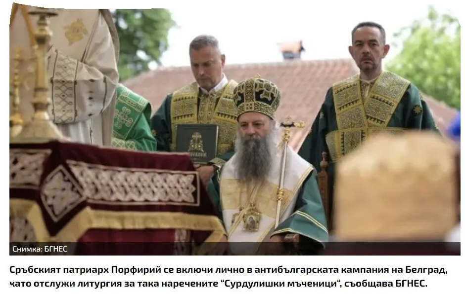 Ο Σέρβος Πατριάρχης Πορφύριος προσχώρησε προσωπικά στην αντιβουλγαρική εκστρατεία στο Βελιγράδι, τελώντας τη λειτουργία για τους λεγόμενους «Σουρδουλομάρτυρες», αναφέρει το BGNES.