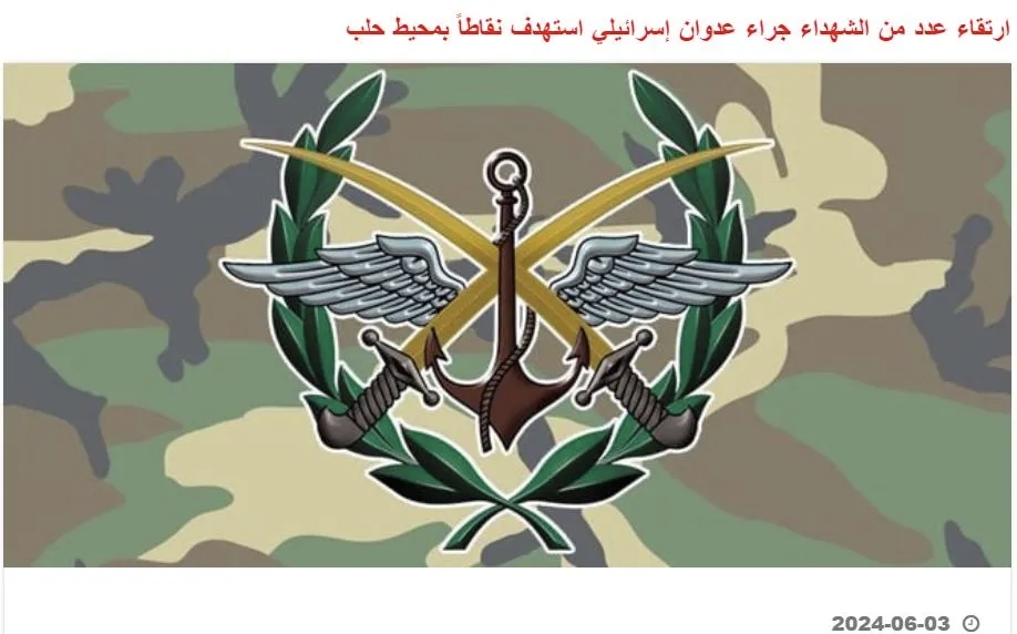 «Περίπου στις 0:20 μετά τα μεσάνυχτα της 3ης Ιουνίου 2024, ο ισραηλινός εχθρός εξαπέλυσε αεροπορική επίθεση από την κατεύθυνση του νοτιοανατολικού Χαλεπίου, στοχεύοντας ορισμένες τοποθεσίες κοντά στο Χαλέπι, με αποτέλεσμα πλήθος νεκρών και κάποιων υλικών απωλειών».