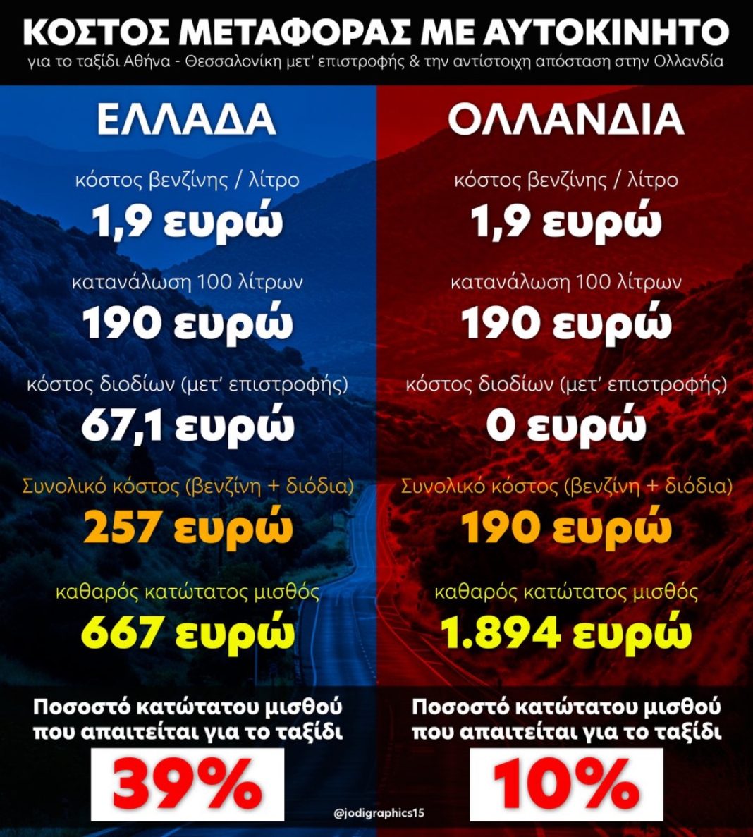 🇳🇱 Για μια αντίστοιχη διαδρομή στην Ολλανδία (όπου δεν υπάρχουν διόδια & η τιμή της βενζίνης είναι στα ίδια επίπεδα με την Ελλάδα), κάποιος που αμείβεται με τον κατώτατο (καθαρά 1.894 ευρώ) θα του κοστίσει το 10% αυτού του μισθού.