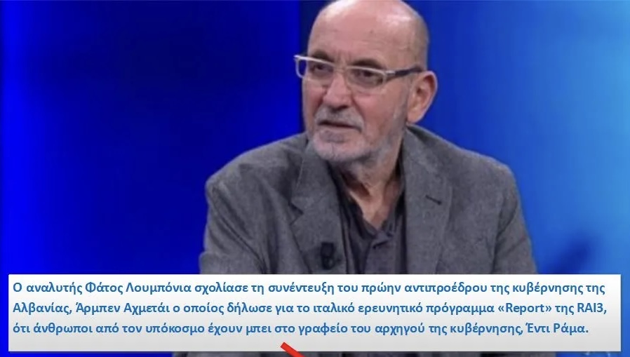 Ο πολιτικός αναλυτής Φάτος Λουμπόνια, οι θέσεις του οποίου έχουν απήχηση πέρα από τα σύνορα της χώρας του, σχολίασε τη συνέντευξη του πρώην αντιπροέδρου της κυβέρνησης της Αλβανίας, Άρμπεν Αχμετάι, ο οποίος σε παρουσία του στο ιταλικό ερευνητικό πρόγραμμα «Report» της RAI3, δήλωσε ότι άνθρωποι από τον υπόκοσμο έχουν μπει στο γραφείο του αρχηγού της κυβέρνησης, Έντι Ράμα, γράφει σήμερα η μεγάλη εφημερίδα των Τιράνων Gazeta Shqiptare.
