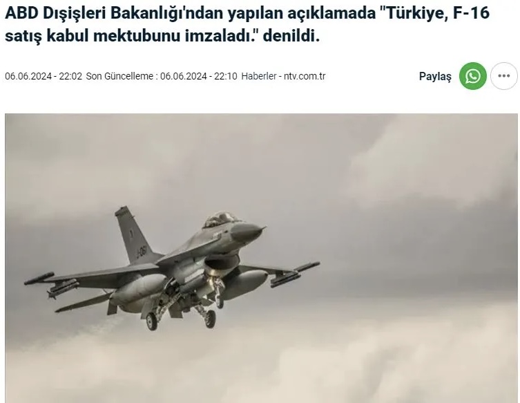 Στη δήλωση του Υπουργείου Εξωτερικών των ΗΠΑ, αναφέρεται: «Η Τουρκία υπέγραψε την επιστολή αποδοχής των πωλήσεων F-16», όπως σημειώνουν σήμερα τα τουρκικά media.