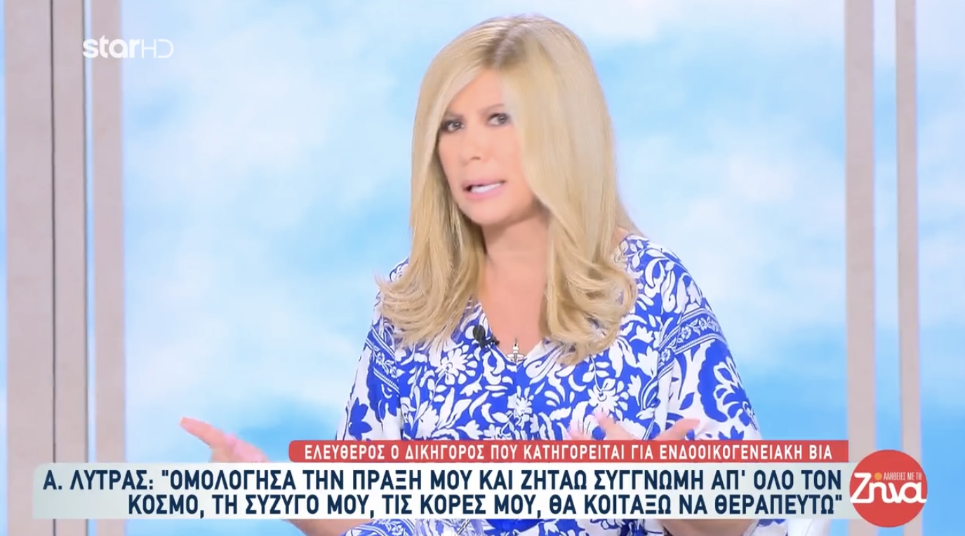 -Αδιαφορώ πλήρως αν πλήττεται η καριέρα οποιουδήποτε κακοποιητή, αλίμονο, δεν με νοιάζει η καριέρα κανενός, ένας άνθρωπος που σηκώνει χέρι σε μια γυναίκα, σε έναν άνδρα, σε έναν άνθρωπο, είναι καταδικαστέος, δεν με νοιάζει η καριέρα του, δεν με νοιάζει να καταστραφεί οποιαδήποτε καριέρα…ούτε του Λύτρα, ούτε κανενός.