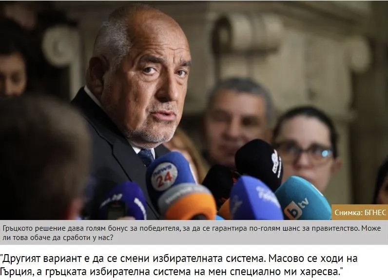 Άρα το σχόλιο του Μπορίσοφ για το ελληνικό εκλογικό σύστημα μπορεί να αποδειχθεί ότι «δοκιμάζει τα νερά» για την εισαγωγή κάτι αντίστοιχου στη χώρα μας.