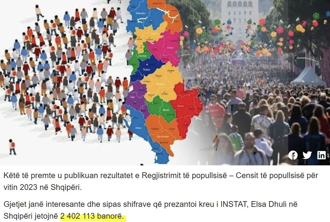 Δημοσιεύθηκαν  τα αποτελέσματα της απογραφής πληθυσμού για το έτος 2023 στην Αλβανία, σύμφωνα με τα στοιχεία που παρουσίασε η επικεφαλής του Ινστιτούτου Στατιστικής, Έλσα Ντούλι, όπως δημοσιεύουν τα αλβανικά media.
