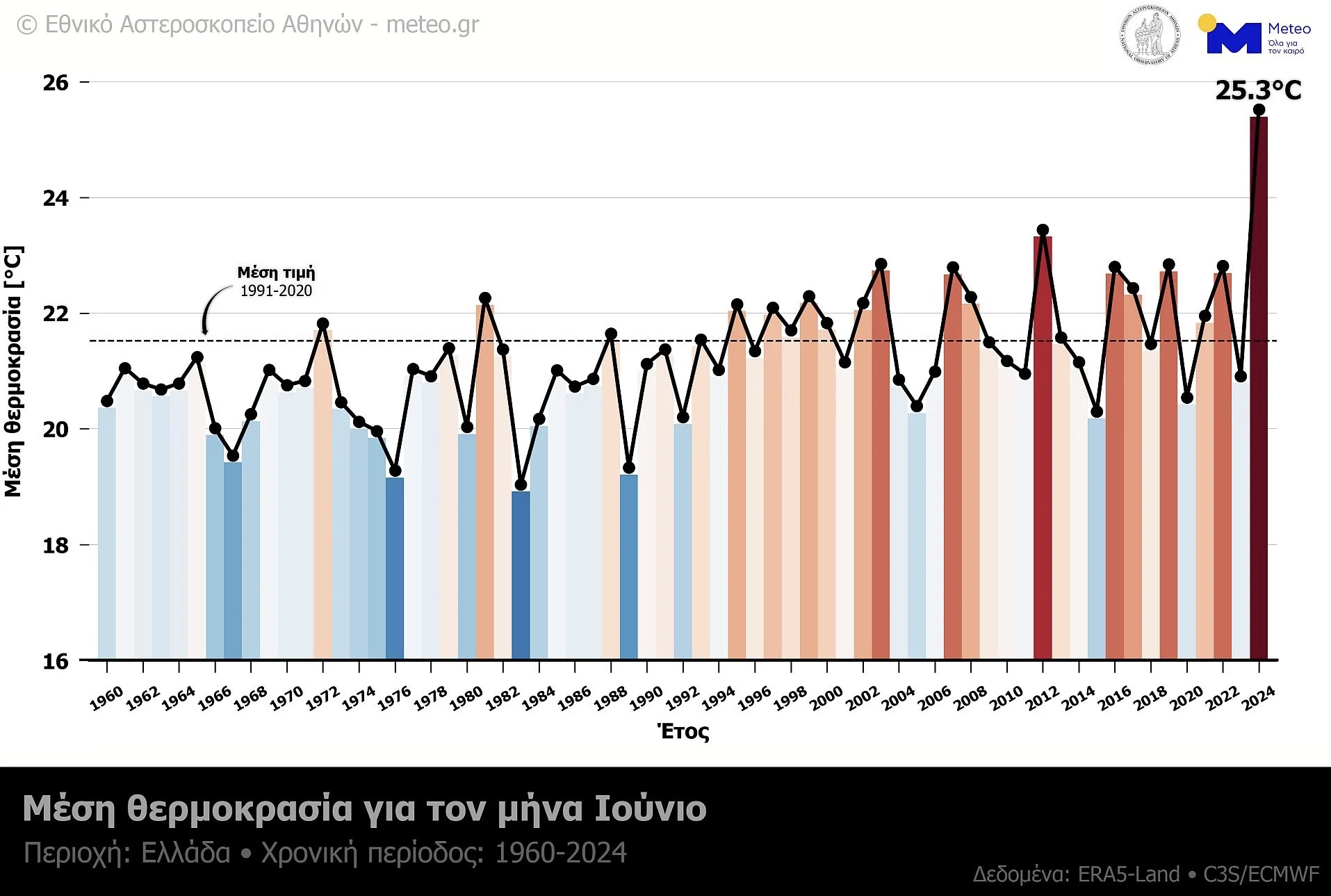 Όσον αφορά την τάση της μέσης θερμοκρασίας στην Ελλάδα από το 1960 μέχρι και το 2024 για την περίοδο του Ιουνίου αυτή παρουσιάζει άνοδο κατά 2.5°C.