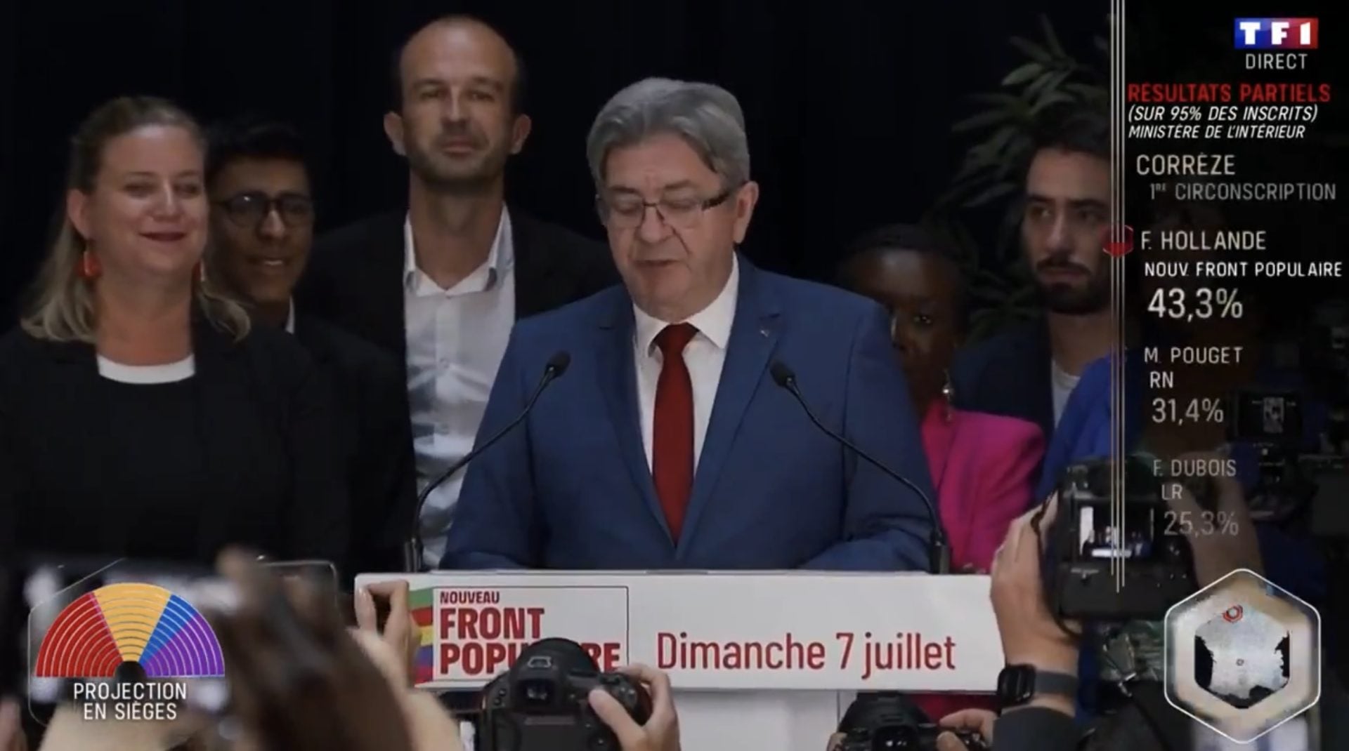 Σύμφωνα με την εκτίμηση του IFOP για το TF1, το Νέο Λαϊκό Μέτωπο εξασφαλίζει 180-215 έδρες στην Γαλλική Εθνοσυνέλευση, ενώ σύμφωνα με την εκτίμηση του Ipsos για την France TV εξασφαλίζει 172-215 έδρες.