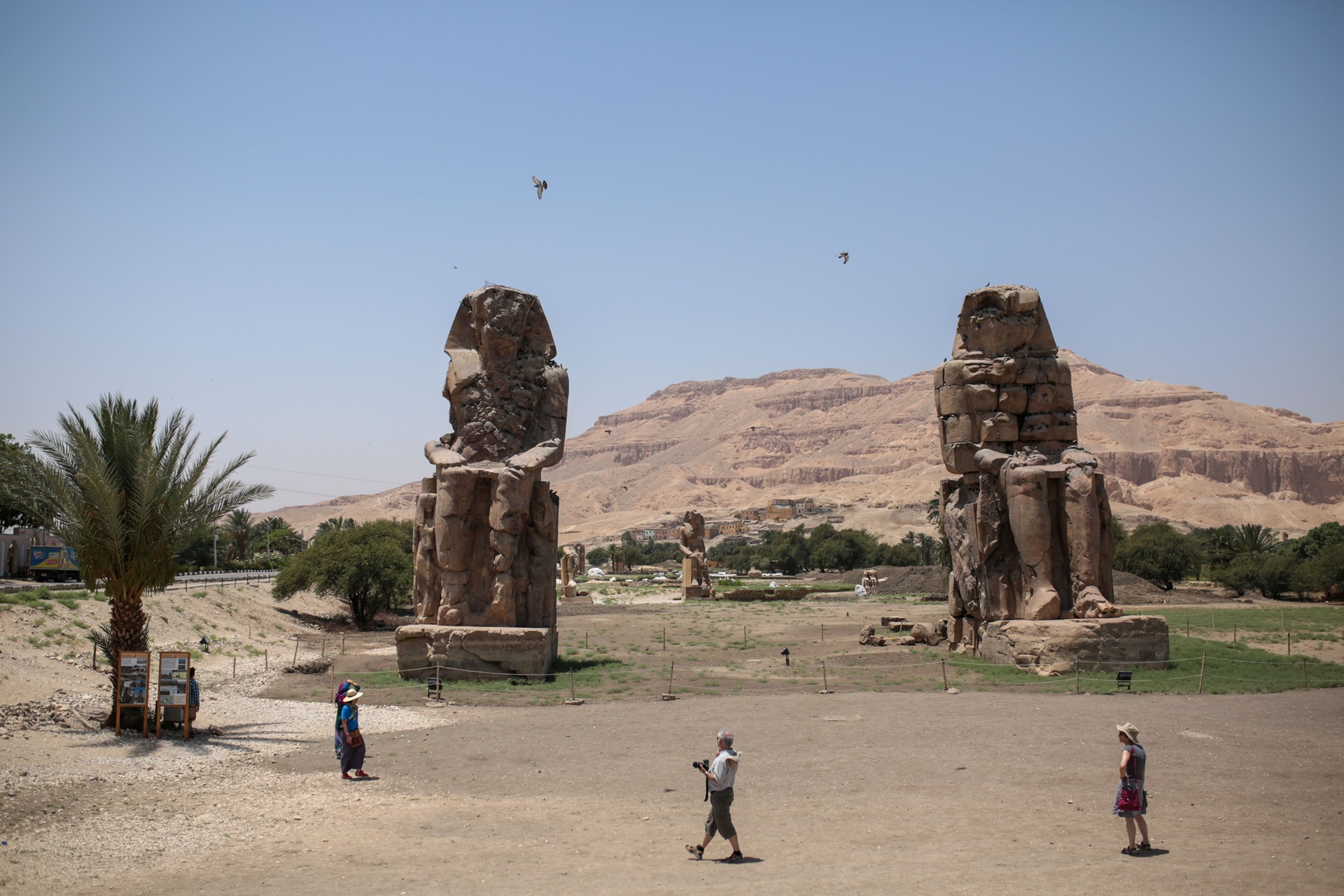 Στην περιοχή αυτή υπάρχουν δυο μεγάλα αγάλματα με ύψος 16 έως 18 μ. και βάρος 800 τόνων το καθένα, τα οποία κατασκευάστηκαν από τον φαραώ Αμένωφις Γ΄ το 1360 π.Χ. Αν και παριστάνουν τον ίδιο τον φαραώ, ονοματίζονται ως «Κολοσσοί του Μέμνονα»[5] και γύρω από αυτά αναφέρονται διάφοροι μύθοι που σχετίζονται με τον Μέμνονα καταγεγραμμένοι από τον Στράβονα και τον Παυσανία.