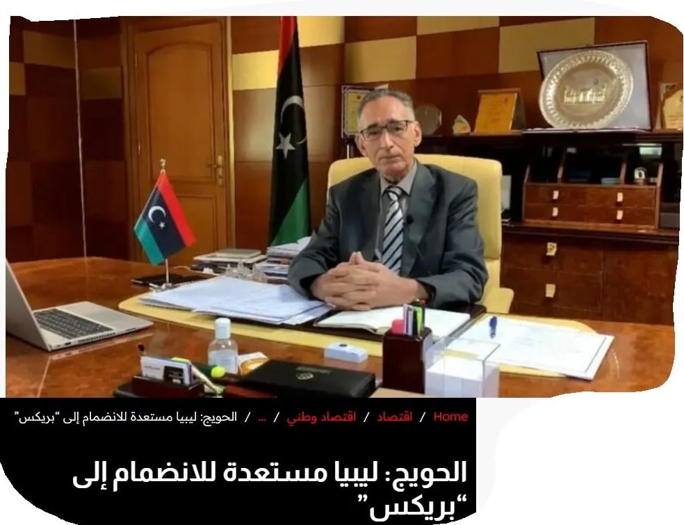 Ο υπουργός Οικονομίας και Εμπορίου της Λιβύης στην Κυβέρνηση Εθνικής Ενότητας (GUN) με έδρα την Τρίπολη, Μοχάμεντ Αλί Αλ Χαουάιτζ, ανακοίνωσε την ετοιμότητα της χώρας να συμμετάσχει στην ομάδα BRICS, δημοσιεύουν τα τοπικά media.